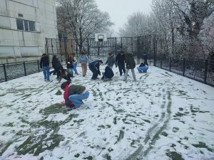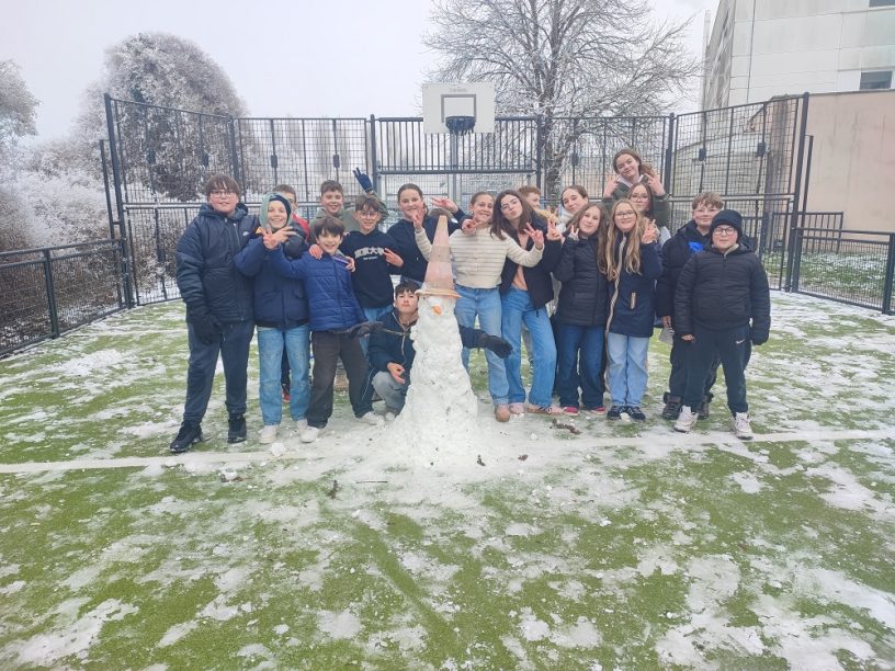 Pour cette nouvelle année 2026, la neige a décidé de pointer le bout de son nez. Du mardi 6 au mercredi 7, le collège s’est retrouvé sous la neige. Les élèves étaient ravis. Tout de suite, des bonhommes de neige ont été créés ainsi que de petites batailles de boules de neige. Pour les élèves ayant sport le mardi matin, M.AUSSEL et Mme. HELIOT ont décidé de laisser 30 minutes avant le sport aux élèves, à côté du gymnase, pour s’amuser dans la neige. Les élèves pouvaient faire de la luge, des batailles de boules de neige entre eux et avec les deux professeurs de sport, des dessins dans la neige et certain élèves ont eu l’idée de faire une course à sac avec des sacs poubelles sensé être utiliser pour faire de la luge. Pendant la récréation, pour les élèves volontaires, il y avait la possibilité de faire de la luge sur la pente à côté du city. De son côté, M.ALINE et des élèves de 5 ème ont créé un bonhomme de neige dans le city, avec une carotte pour le nez, un plot en guise de chapeau et des branches pour les bras.